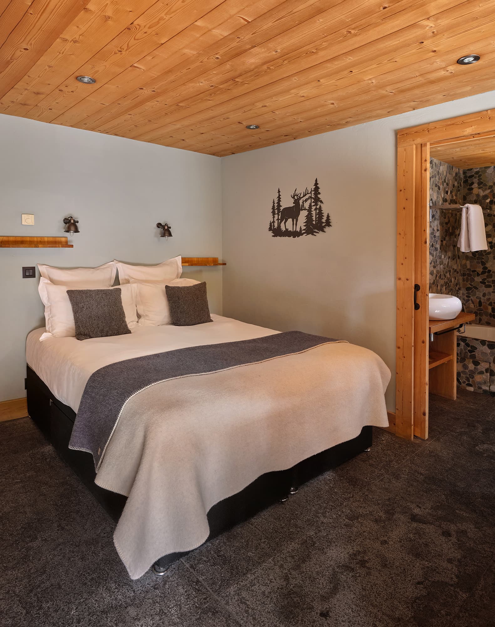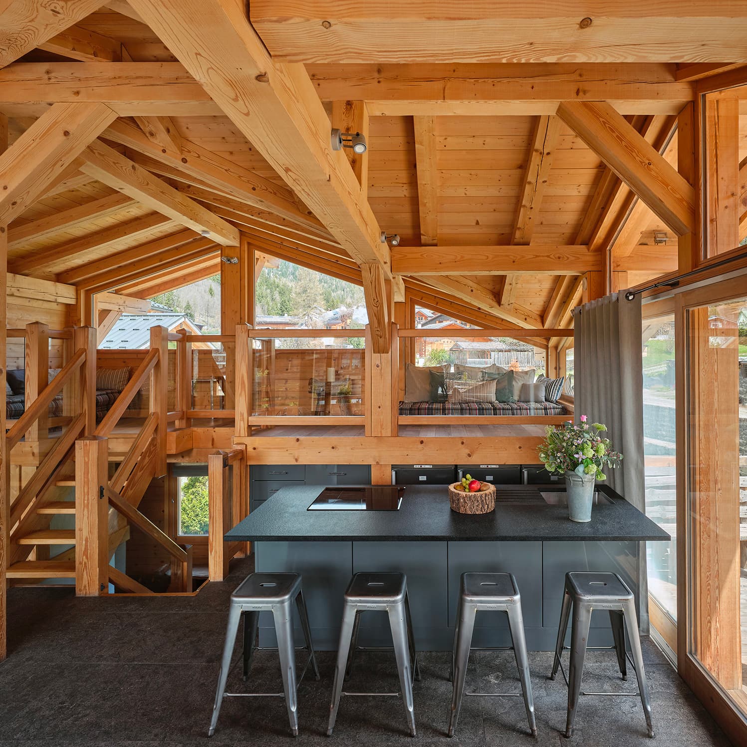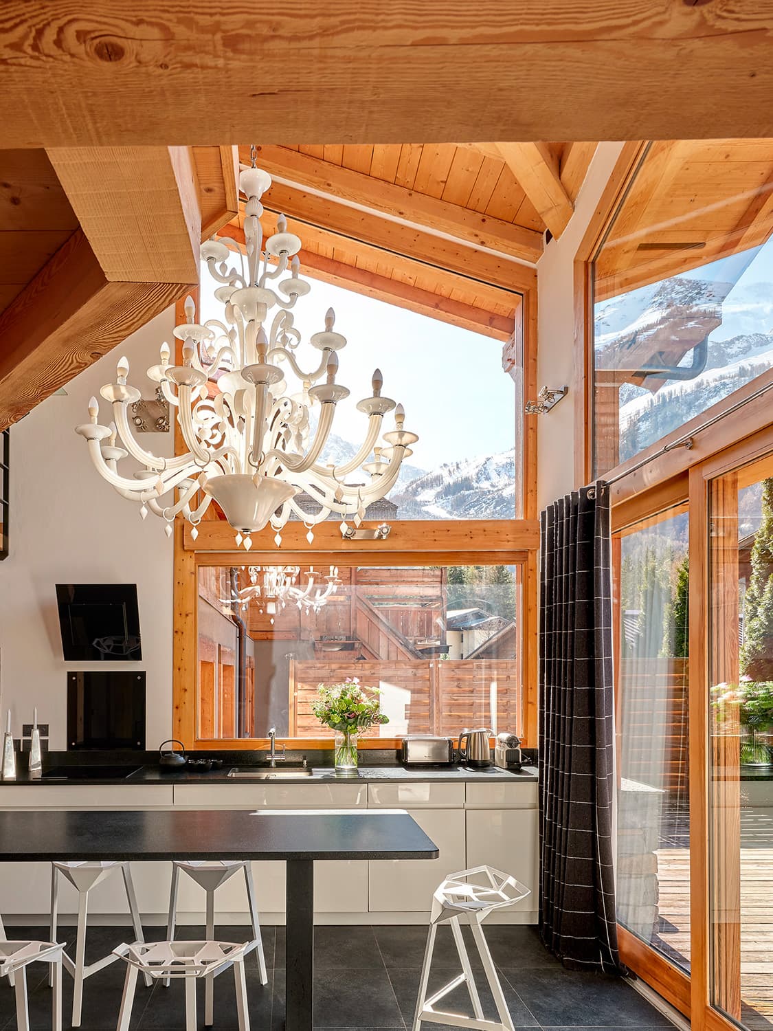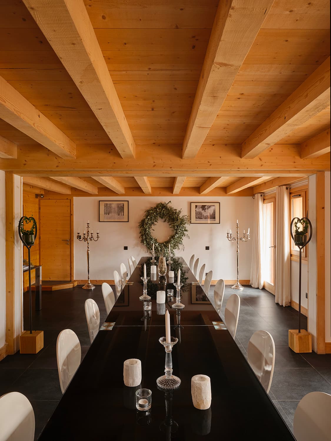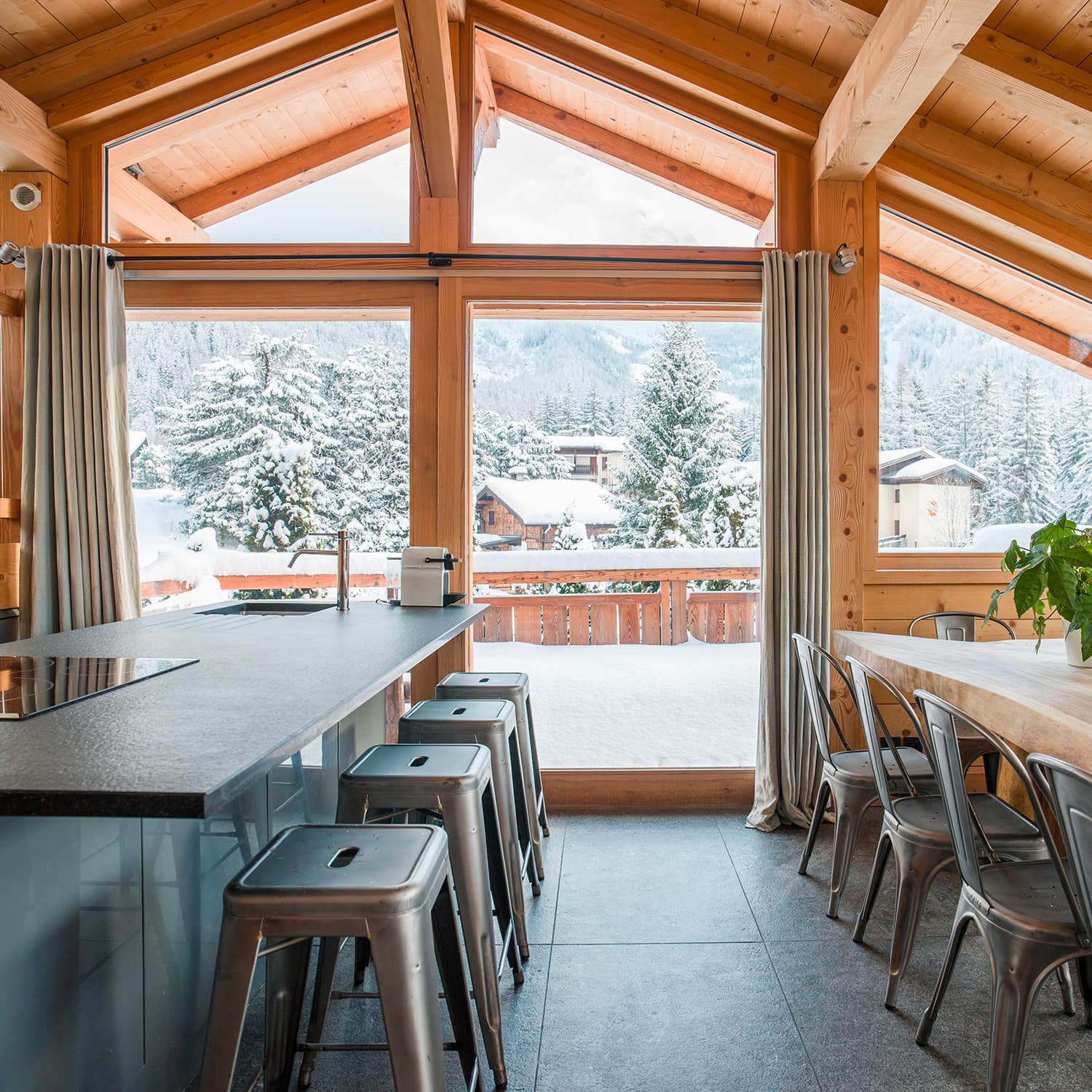 À partir de 8 000 € la semaineLa jonction des chalets Granit et Cristal forment le chalet Quartz. Connectés par une immense salle plénière, permettant de grandes tablées et réunions.
